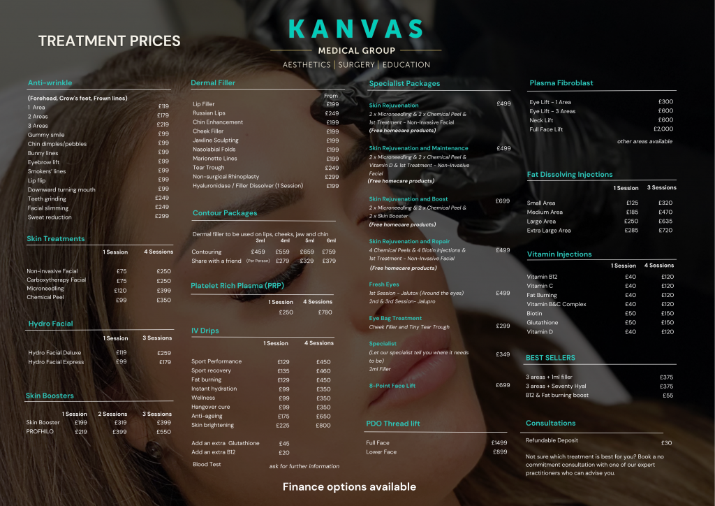 Discover the prices of our high-quality services and products at Kanvas Medical Bromley. We offer affordable options to help you look and feel your best.